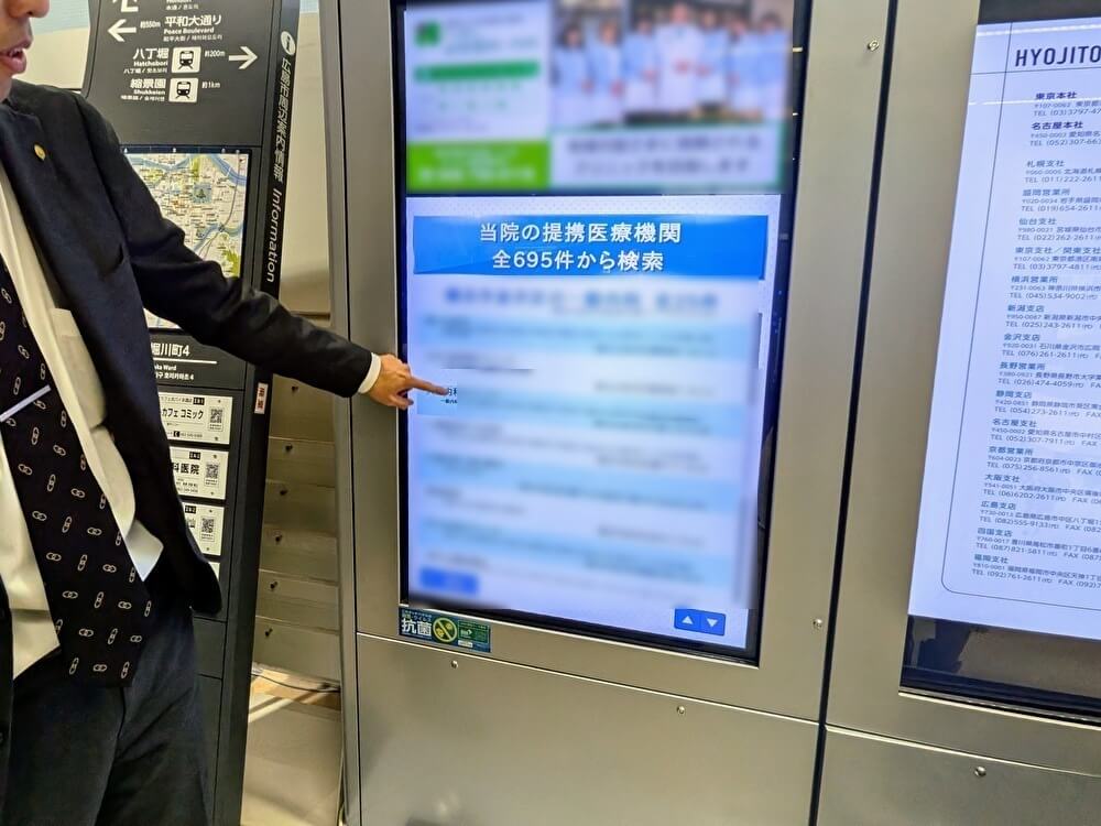 シティナビタの第一号を導入したのは、天白区役所でした。なかなか行政の施設に広告付きの設備を導入することは厳しく、それができる企業もほとんどおりませんでした。そのため、この導入をきっかけとしてシティナビタは拡大していき、現在は全国1,054ヵ所に導入できています。駅設置型のステーションナビタですと、メインのコンテンツは駅の周辺図です。しかしシティナビタの場合は、その自治体の周辺区域全図を表示するようにしています。エリアごとの特長やランドマークを紹介したり、緊急避難地域を表示したりといった情報を載せられるようにしているんです。それと、役所のフロアマップも掲示できます。このような様々な情報が掲載されることで、利用者の利便性が高くなる機能ですね。もう1つ、地域の中核病院向けに展開しているメディカルナビタという商品もあります。こちらは、病院周辺図の掲載はもちろんなのですが、それ以上に提携病院の検索ができることにこだわっています」