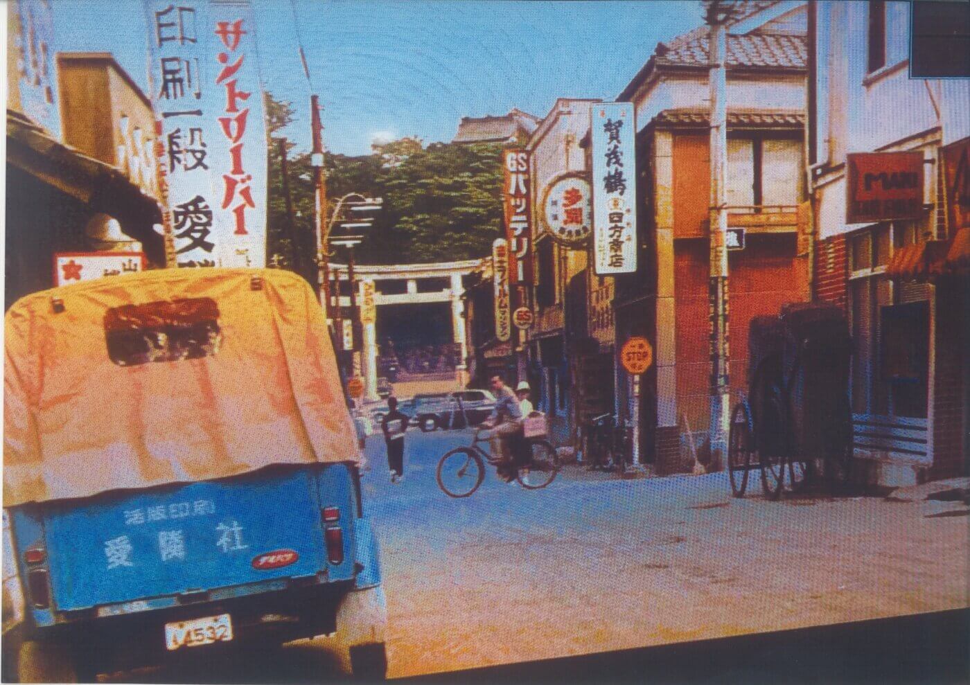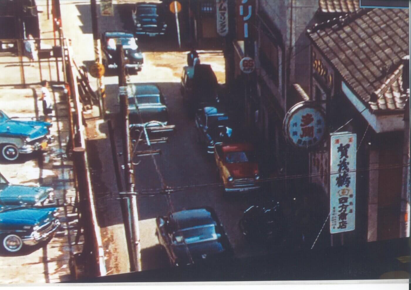 昭和35年(1960)に公開された映画『赤坂の姉妹より 夜の肌』に、空襲で史料が残っていない戦前の店舗の姿が登場。道の向こうには「山王さん」と呼ばれ親しまれる日枝神社の鳥居が。画像提供:株式会社 四方