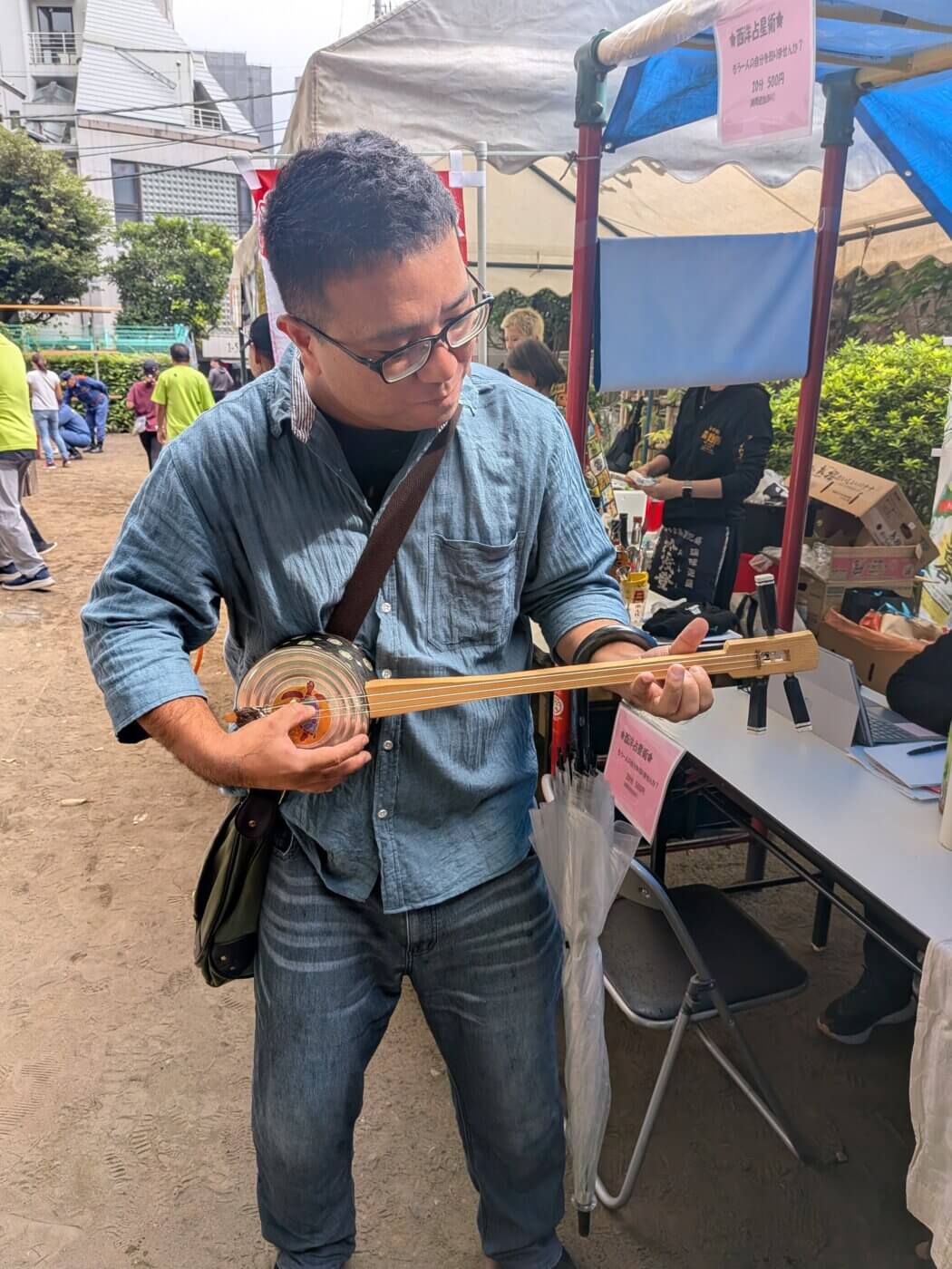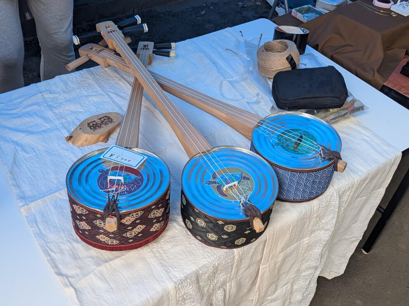 「島唄楽園」の料理長が石垣島ご出身ということもあり、屋台には空き缶で作った「カンカラ三線」も展示販売されていました。まるで本場・沖縄のお祭りに訪れているかのような気分に。