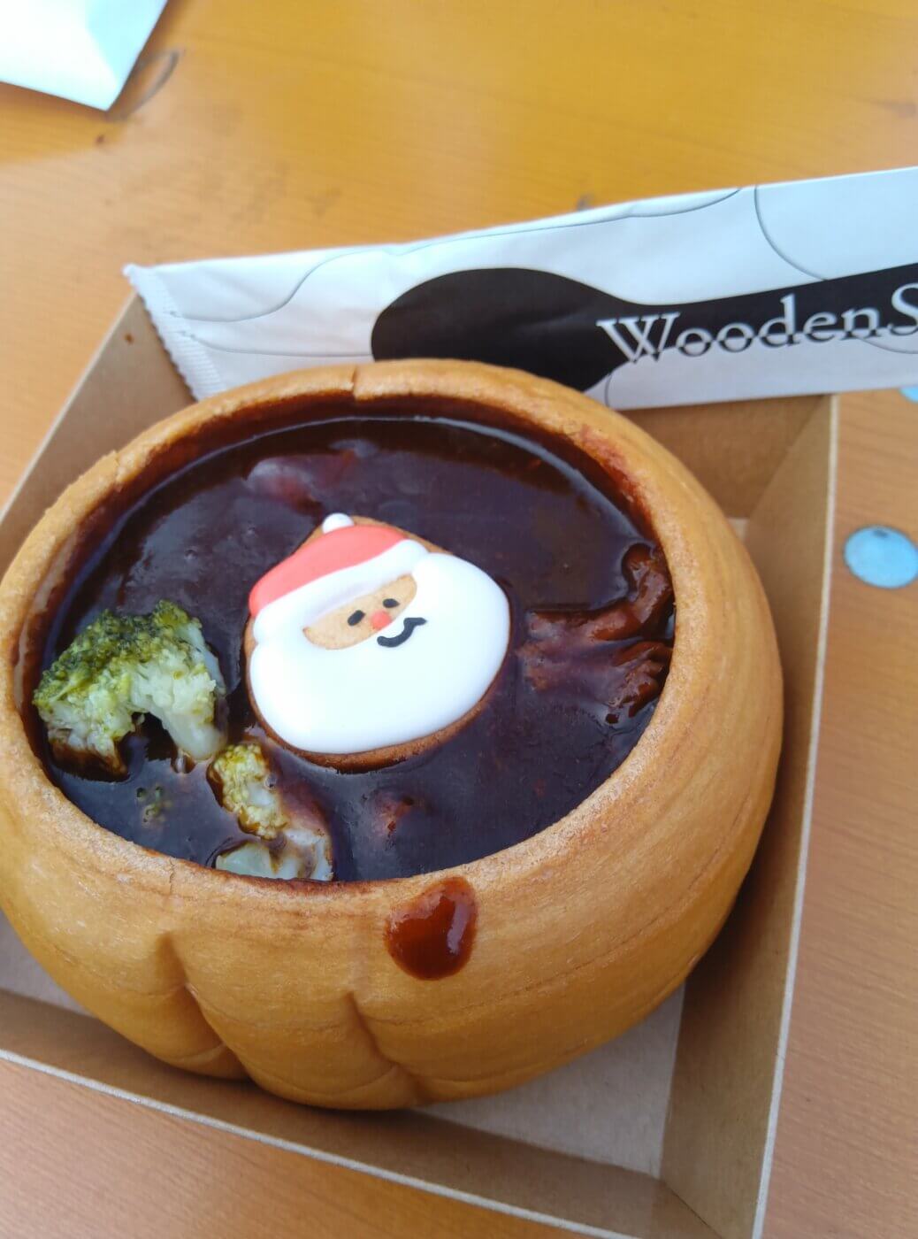 パンの器に盛りつけられたサンタさんの牛タンシチュー。食べるのがもったいないほどのかわいさです。