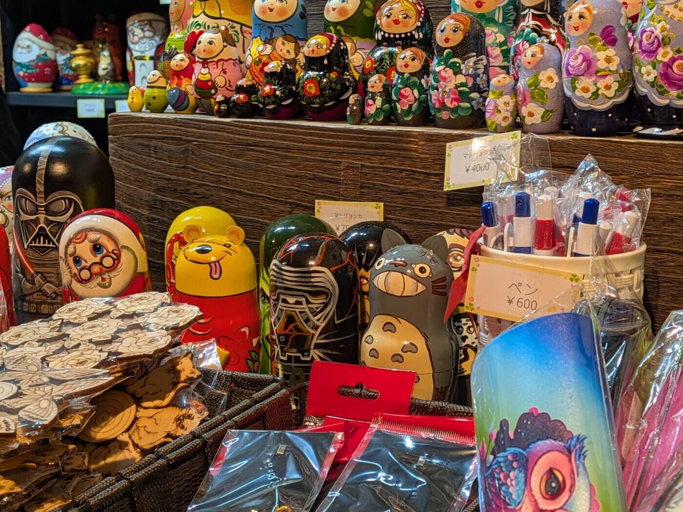 ロシアの伝統的な木製人形「マトリョーシカ」専門店にて。トトロやプーさんなど馴染みのある顔ぶれも。
