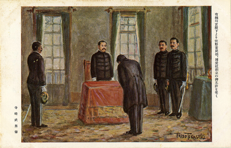 有栖川宮熾仁親王から博愛社設立の許可を受ける佐野常民(寺崎武男『博愛社創設許可の図』)