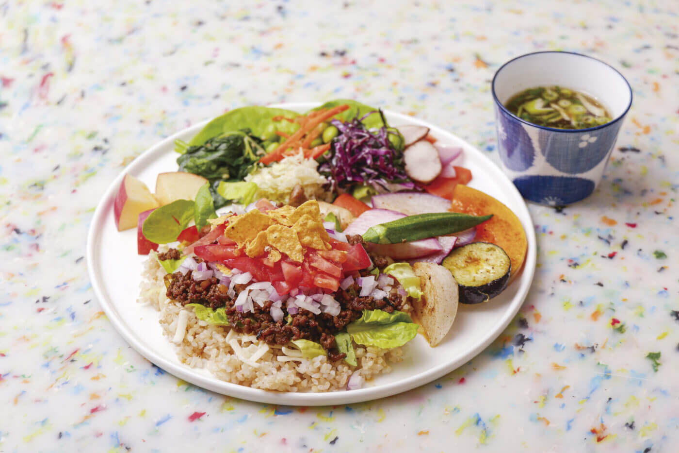 「サステイナブル」と聞くと、少し身構えてしまうかもしれません。でも「Sustainable Food Lab」のタコライスは、普段の食事に自然となじむサステナ食材を使ったメニュー。生産者や調理する人、そして食べる私たちが、ほんの少し意識を向けるだけで、食を通じた豊かな暮らしが広がります。難しいことは考えず、野菜たっぷりの一皿を美味しく、お腹いっぱいいただきましょう。