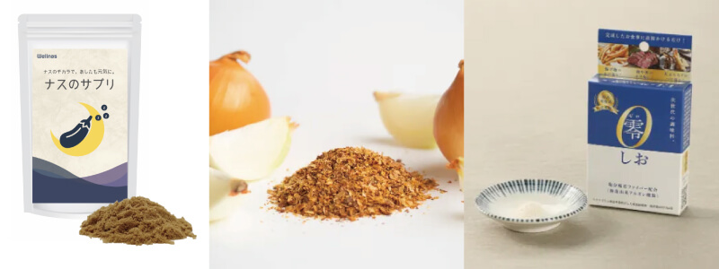 (左から)「機能性ナス粉末(ウェルナス)」、「タマネギぐるりこ」、「零しお」 ※画像提供:UR都市機構