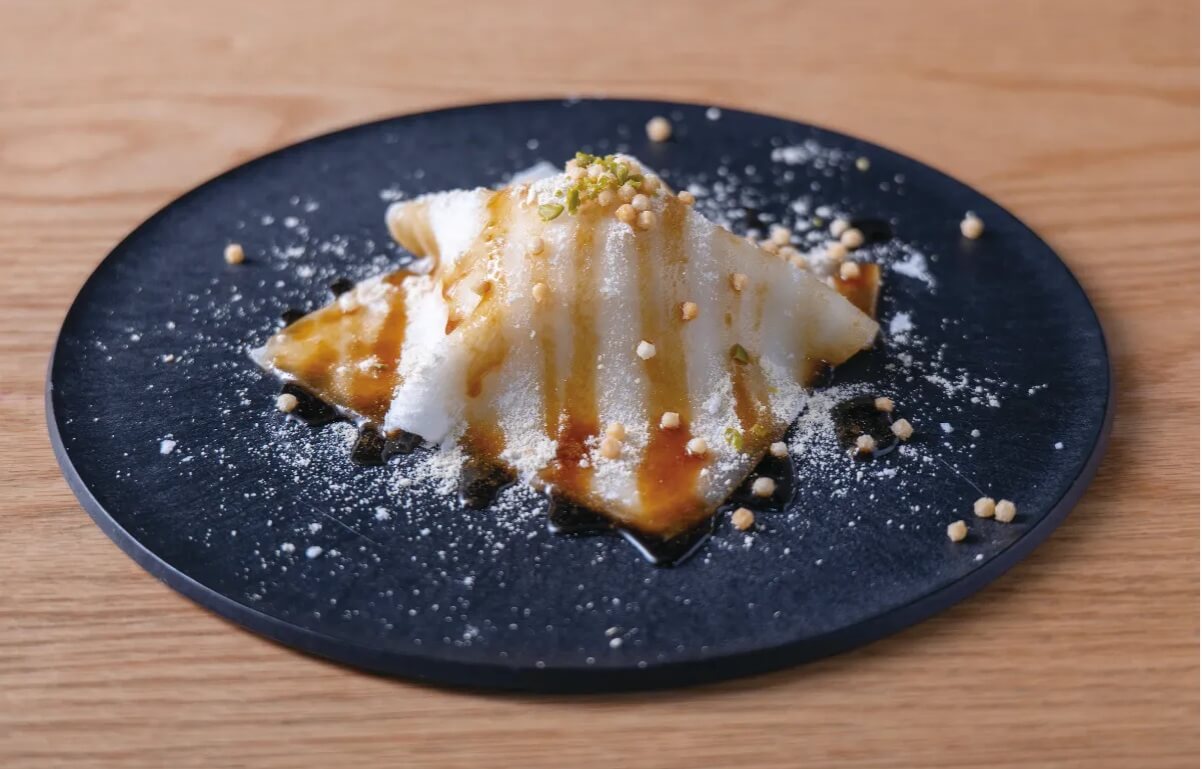最初は沖縄の海のように深い蒼が印象的なバタフライピーは、レモンを絞ると星空のような紫にその見た目を変化させる、不思議なハーブティー。見た目の綺麗さに目を奪われ、セレクトしたそう。お米由来のアイスクリームとともに、メインもデザートも100% plants baseの美味しいヴィーガン食を叶えます。