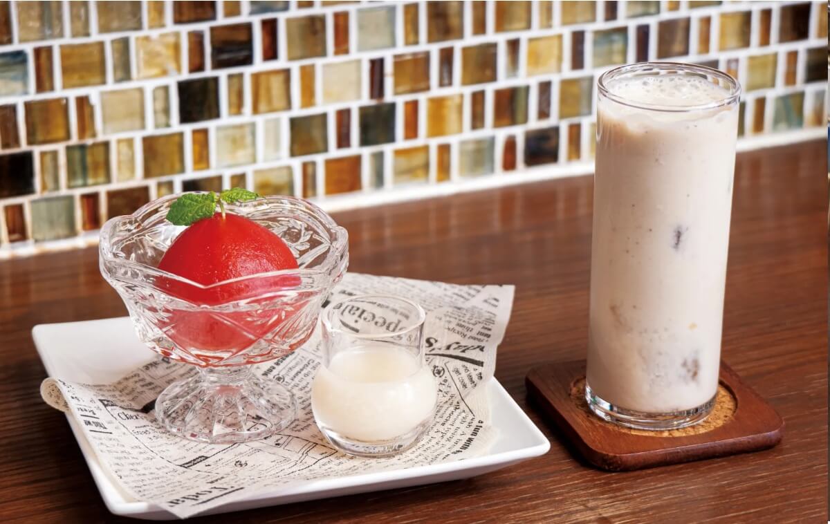 ショウガ味の米麹甘酒を飲んでひらめいたという、「まるでフルーツ トマトのコンポート オリゼ甘酒生姜風味かけ」。甘酒+トマトという一見味の想像がつかない組み合わせですが、それぞれの味を引き立て、最後にはショウガのさわやかな風味が。「オリゼ甘酒バナナオレ」は、スタッフも太鼓判のおいしさはもちろん、自宅でも再現できるレシピを考えたかったという想いからできた一品。