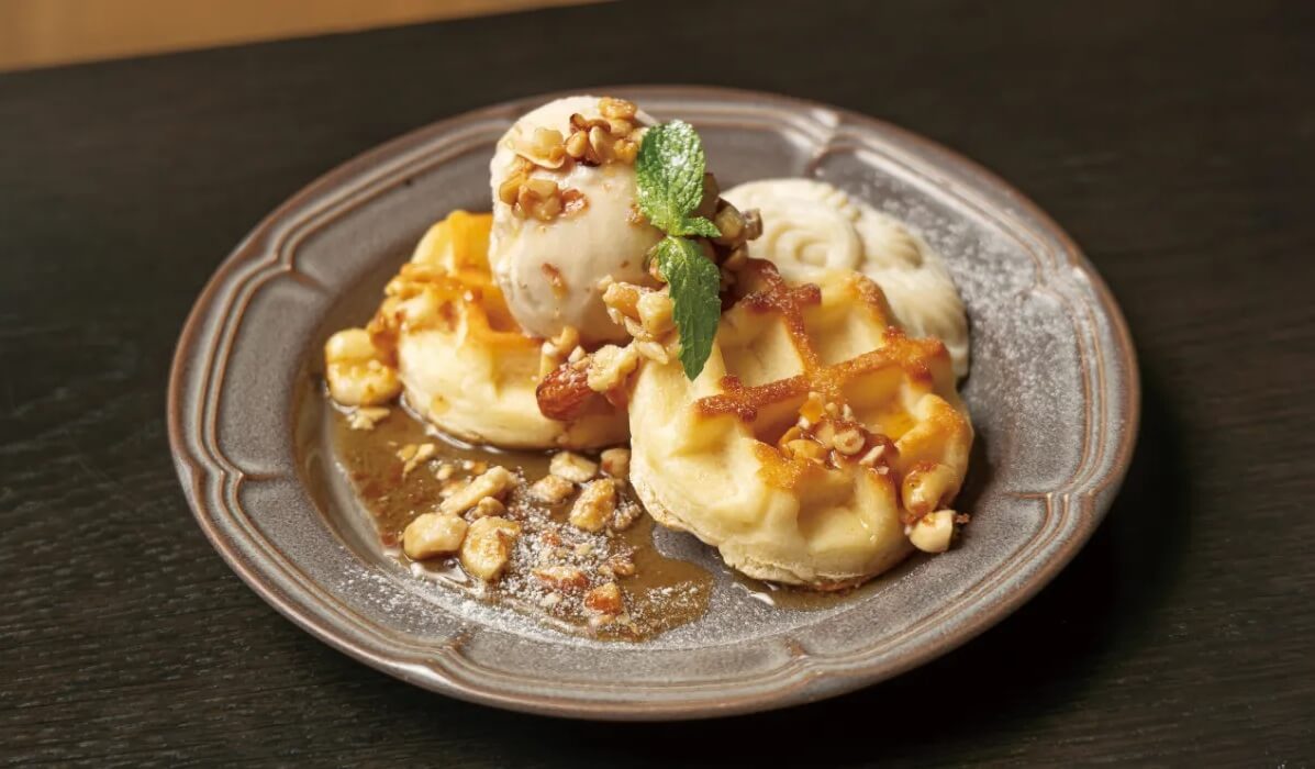 豆腐・米麹・蒟蒻など日本の伝統素材から作られたふんわり食感の「NINZIAワッフル」とお米由来のアイスクリームを組み合わせた、「豆富ワッフル メイプルナッツ&ライスクリーム」。植物性や生産背景だけでなく、素直に「おいしい」「継続的に取り入れられる」と感じたことが決め手だそう。温かいワッフルに冷たいアイス+豆乳クリームという、見た目からも感じられるおいしさと共にいただきましょう。