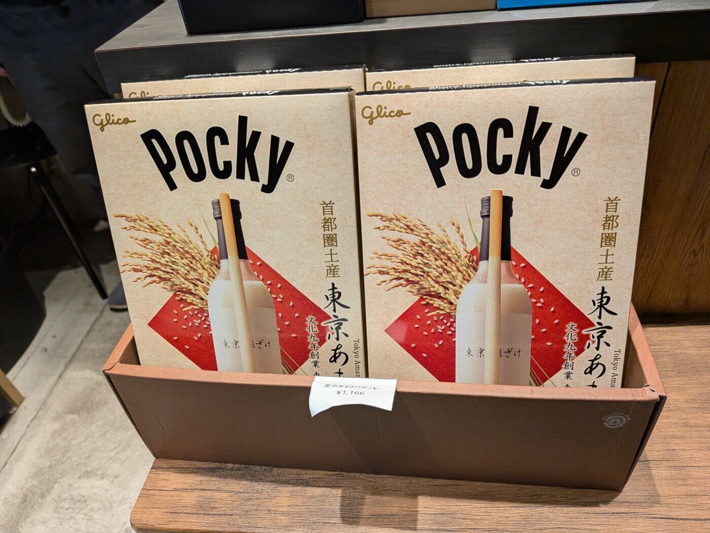 ショップには甘酒味のユニークなポッキーが並べられていました。原料すべてが東京産という「東京あまざけ」のポッキーです。