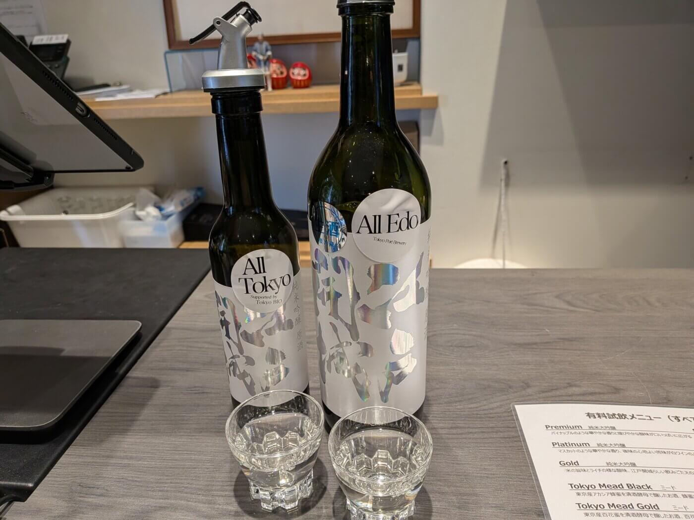 東京の水道水、東京産のお米とオリジナル酵母を使用した「All Tokyo(左)」と最古の清酒酵母(Edo酵母)で造った「All Edo(右)」。