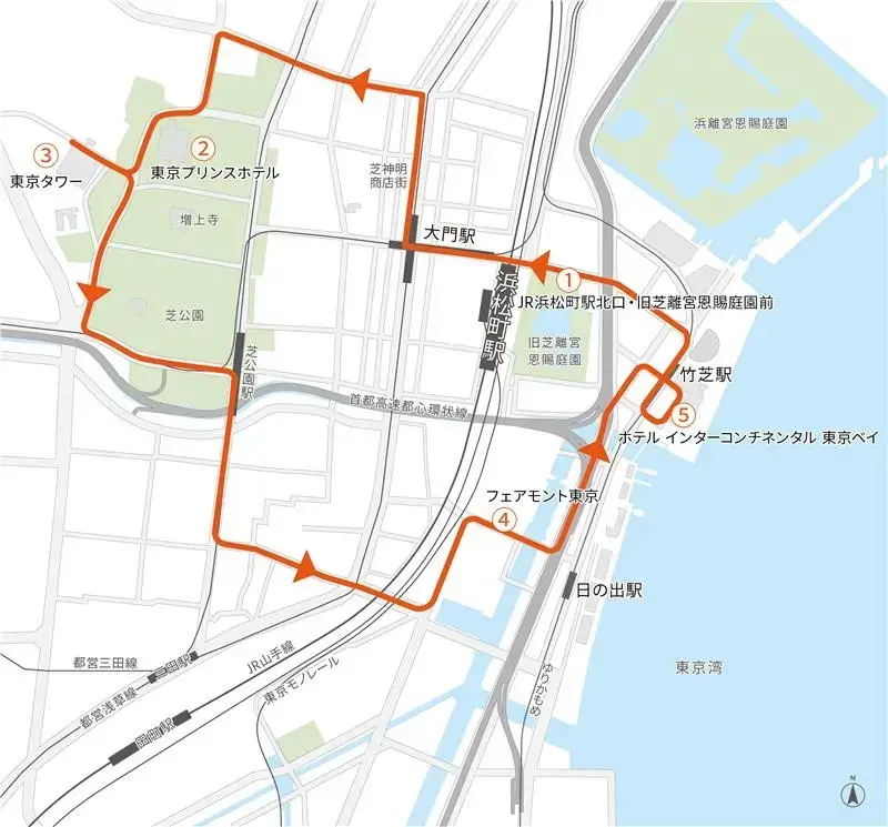 2025年に試験運行した無料循環バスは、浜松町駅、大門、東京プリンスホテル、東京タワー、フェアモント東京、竹芝エリアを1周回るルートです。