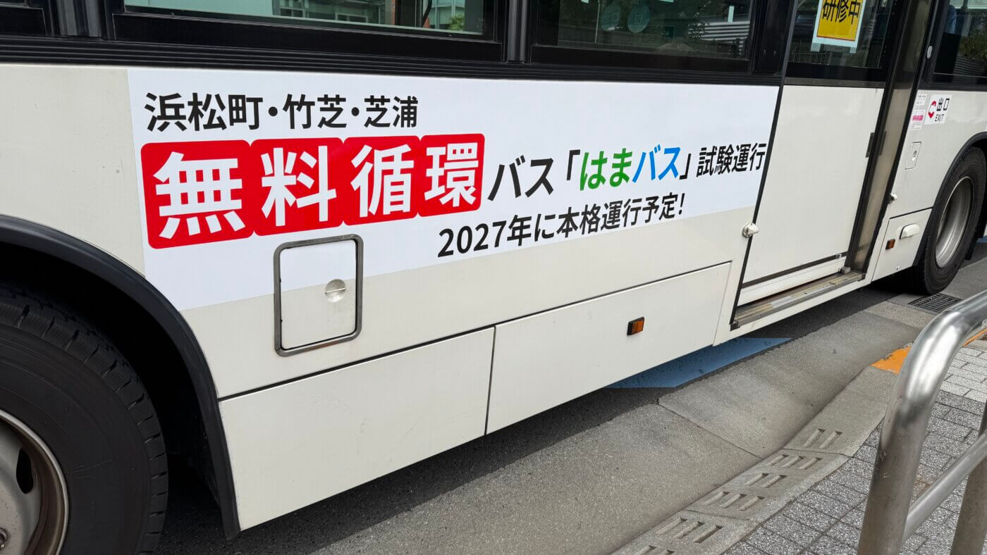 「無料循環」が分かりやすいよう、試験運行時からアピール。 画像提供:一般社団法人 浜松町芝大門エリアマネジメント