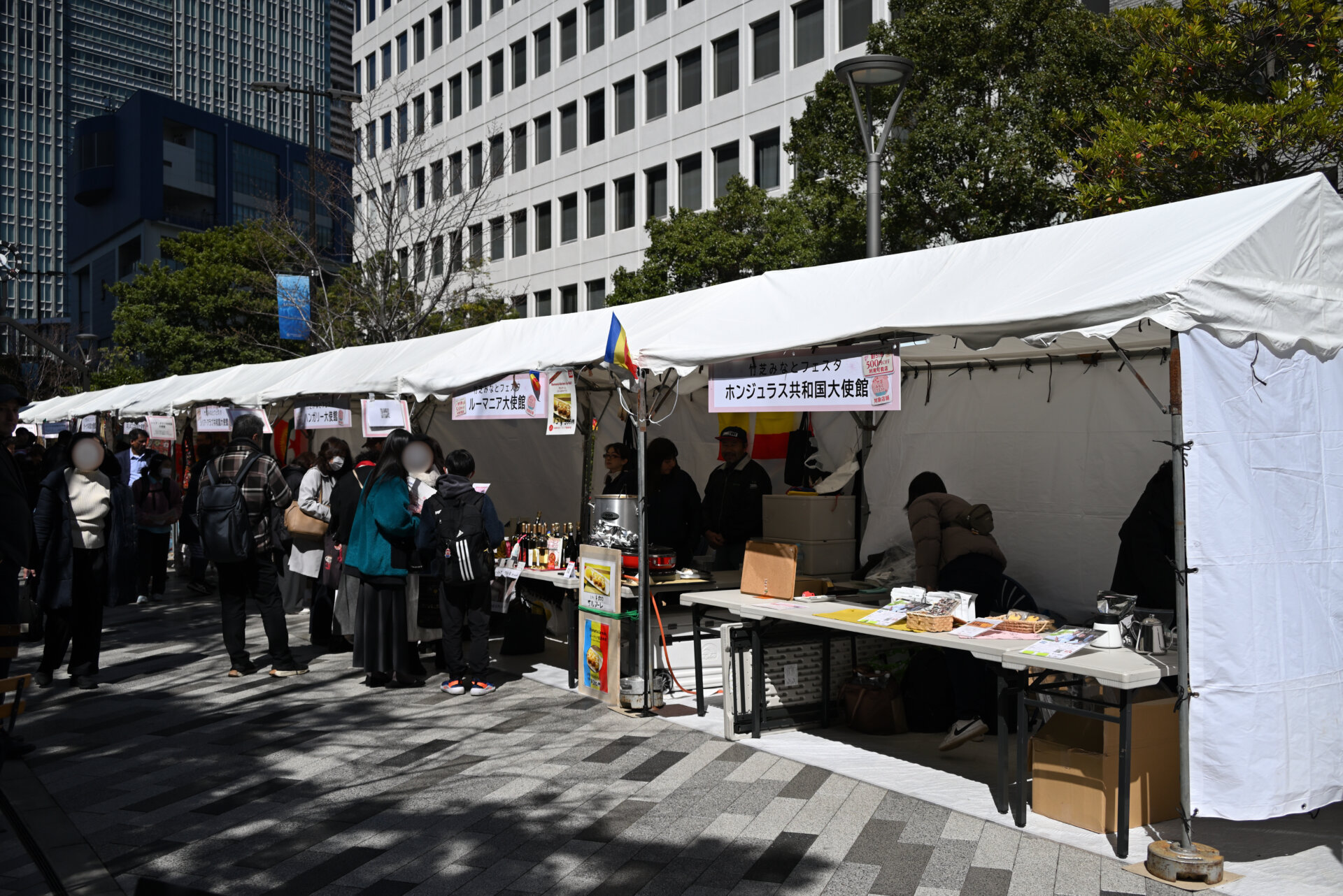 改めて東京ポートシティ竹芝の会場を見渡してみると、道路沿いには、港区らしく11の大使館が各国の料理やワイン・飲み物などを販売するブースが並んでいました。イベント当日は海沿いということもありまだまだ肌寒く、ウクライナ大使館が販売していたボルシチなどが人気のようでした。