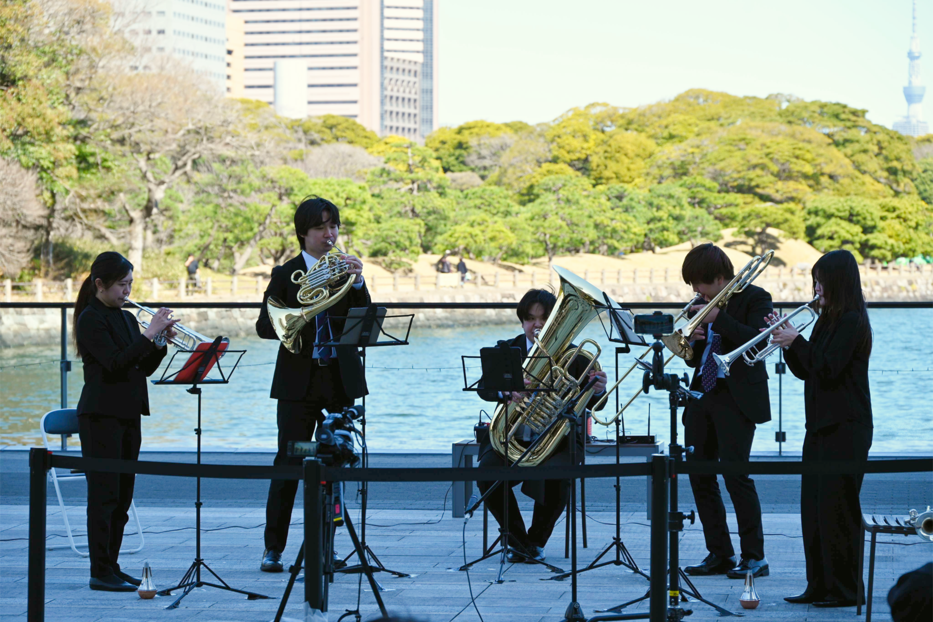 ウォーターズ竹芝に目を移すと、令和7年度の「東京都・港区芸術文化連携事業 まちなかコンサート」の一環として、ウォーターズ竹芝の芝生広場では「しおかぜコンサート」と題して金管楽器の野外コンサートも行われていました。港区が関わっていることで、イベントのコンテンツにも幅が生まれている一つの例といえます。