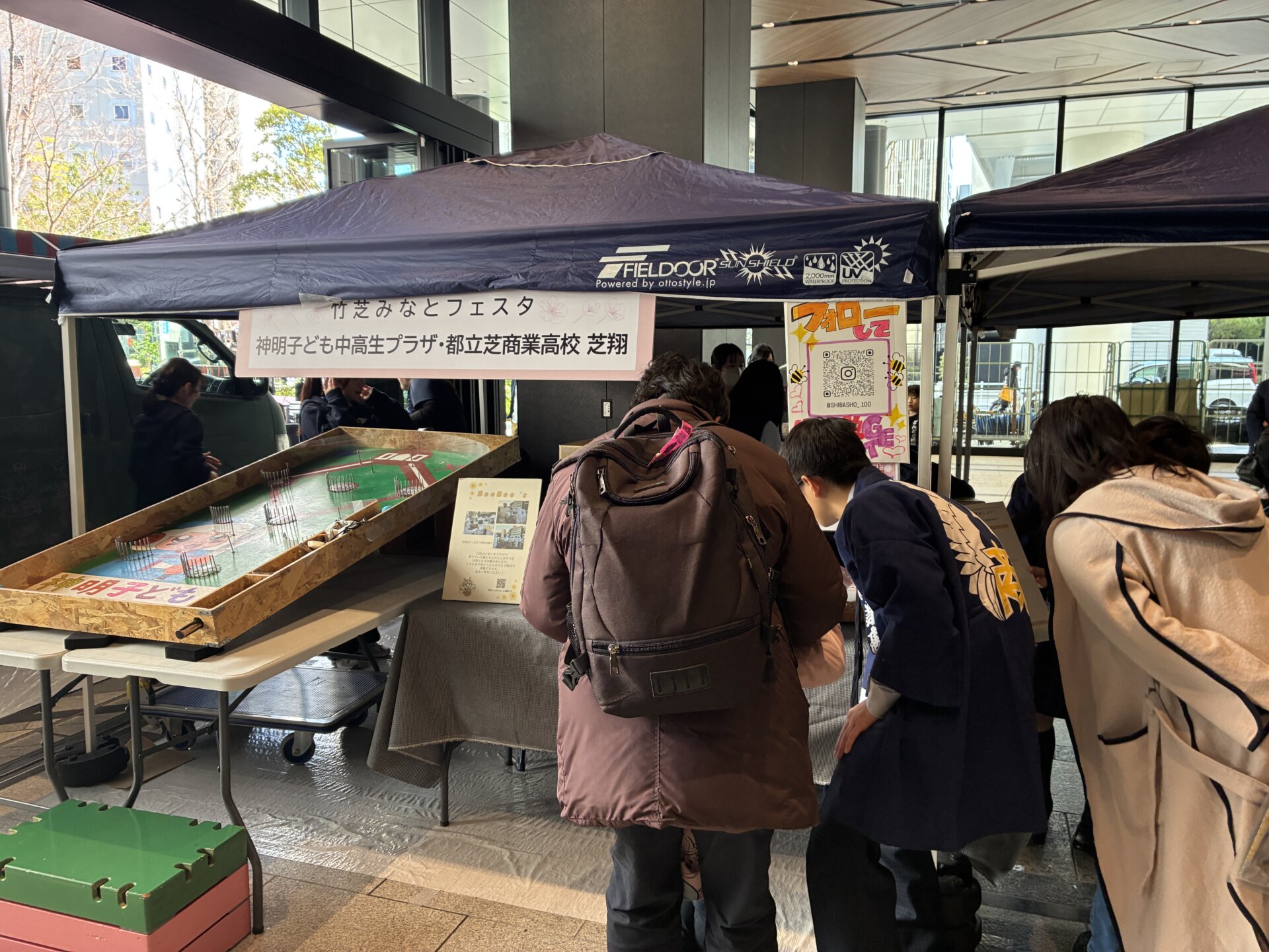 学生によるコンテンツは、音楽ステージ上の演奏だけではありません。東京ポートシティ竹芝のポートホール内では、神明子ども中高生プラザ&都立芝商業高等学校のブースで「しばみつ」を使った飴の販売や手作りゲームなど、学生たちが日ごろの活動をアピールしていました。