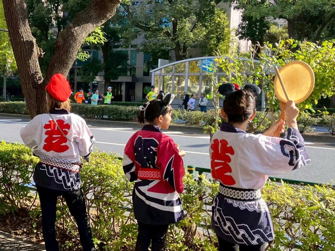 数年前から参加している「MINATOシティハーフマラソン」応援盆踊りでのワンシーン。 画像提供:源流芝太鼓連