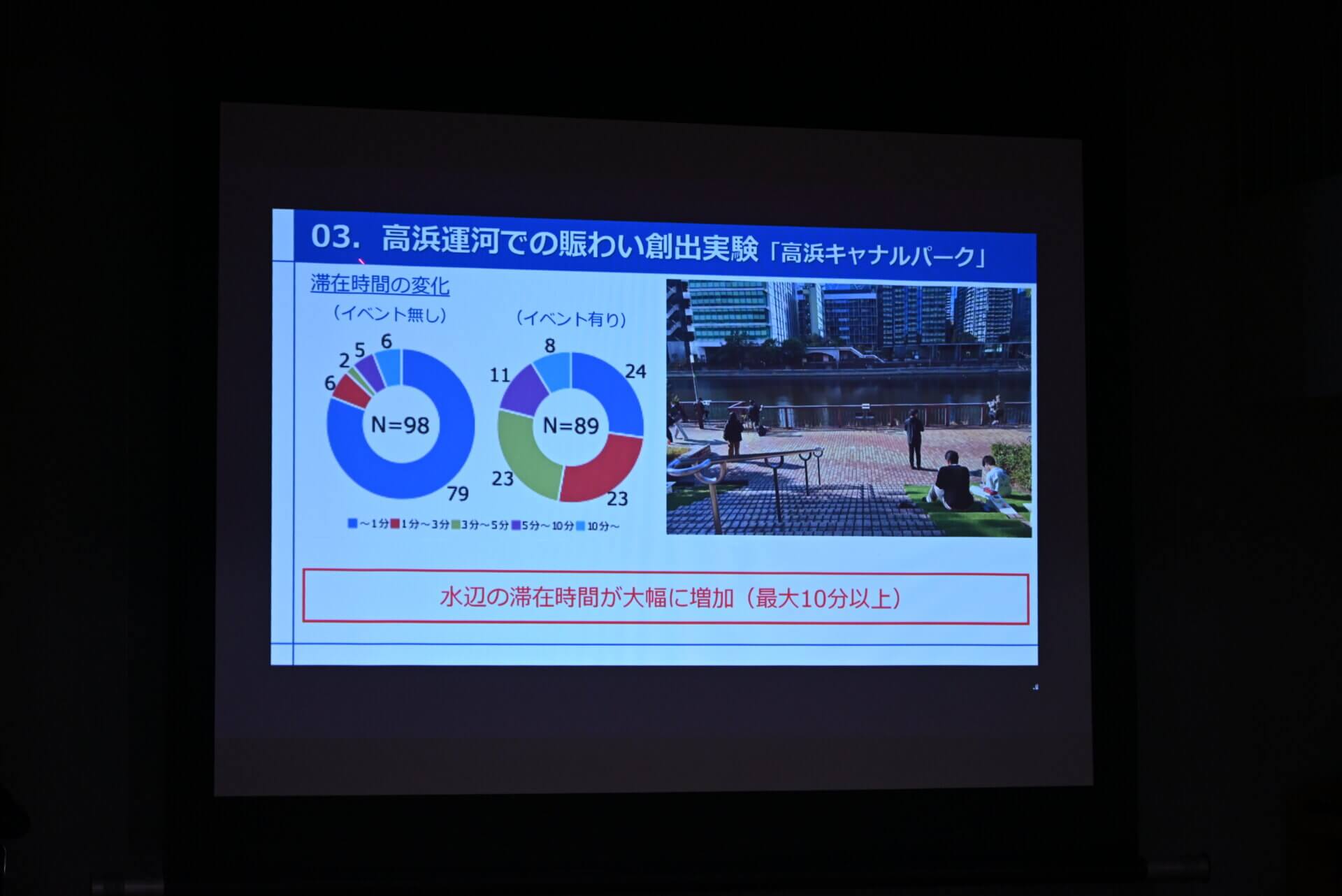 そして、実証実験として高浜運河(品川駅港南エリアの運河)でその場に留まれるように椅子などを設置したところ、滞在時間が最大10分以上増加した取り組みを紹介。